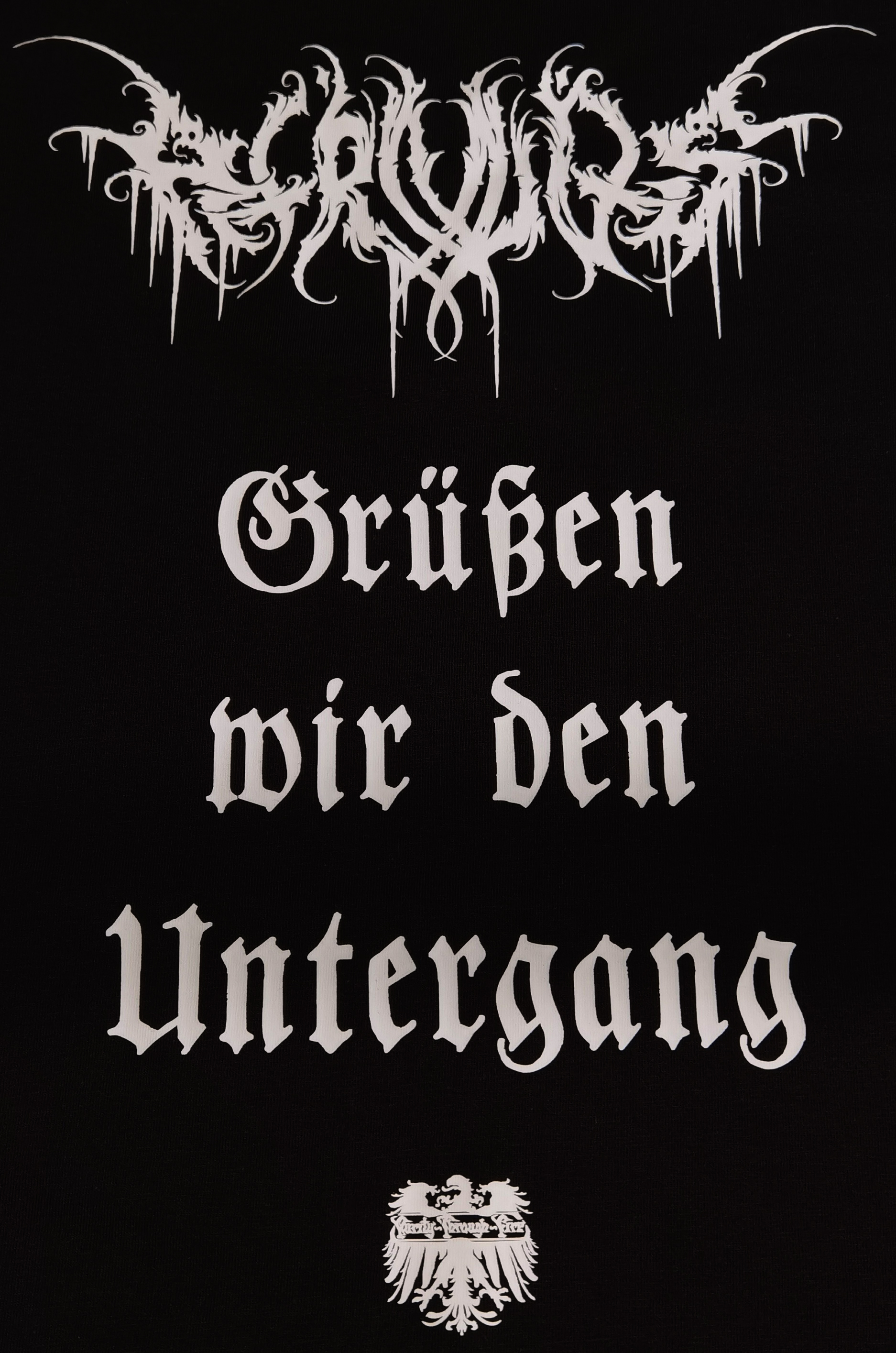 Das Foto zeigt den Druck auf einem Shirt in Größe S.
